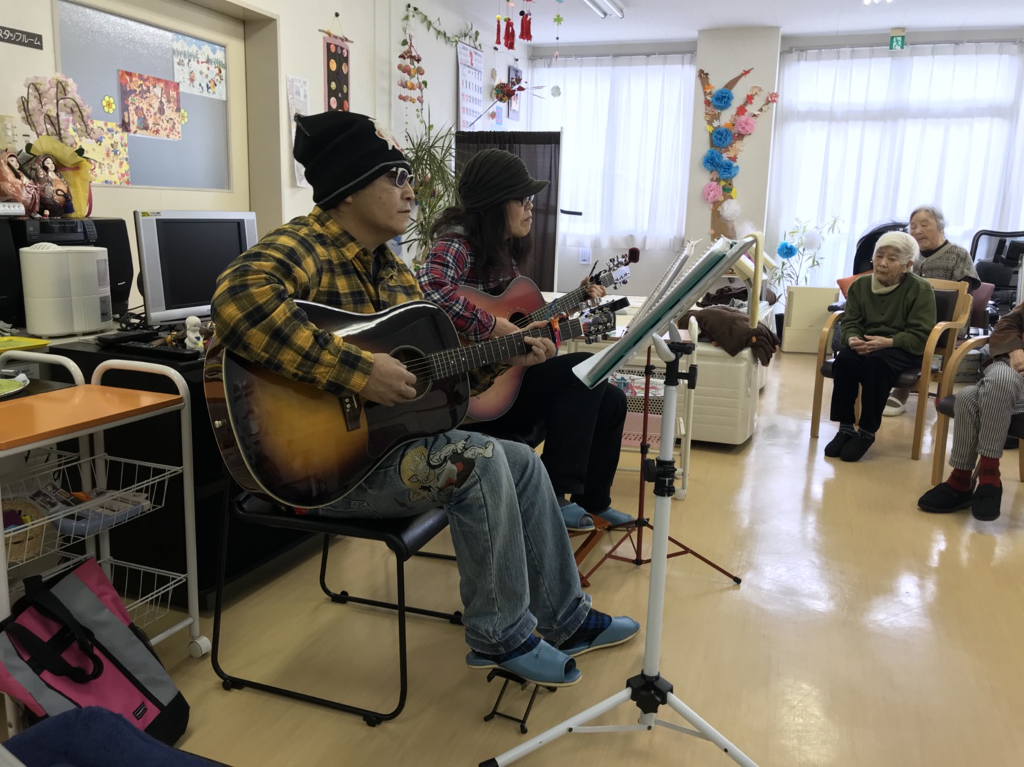 2月の行事⭐今年の2月は、雪も多く寒かったですね😃 なごみの郷では、2月の行事として節分では豆まきをしました❗ スタッフが鬼となり、新聞紙を丸めたボールを豆に見立てて(^3^)/ 『 鬼は外〰 』 みんな必死に投げられていました❗もうひとつは、利用者の息子さんが慰問され ギター片手に唄を歌いに来て頂きました(^-^) 青い山脈や、雪国を一緒に歌いながら手拍子で盛り上げて頂きました☺ ちなみに、ユニット名はココムーンだそうです! 寒い季節には 、室内で楽しめる行事をまた、考えたいと思います😃 介護施設 なごみの郷共有:Tweet クリックして友達にメールでリンクを送信 (新しいウィンドウで開きます) メールアドレス クリックして印刷 (新しいウィンドウで開きます) 印刷 関連