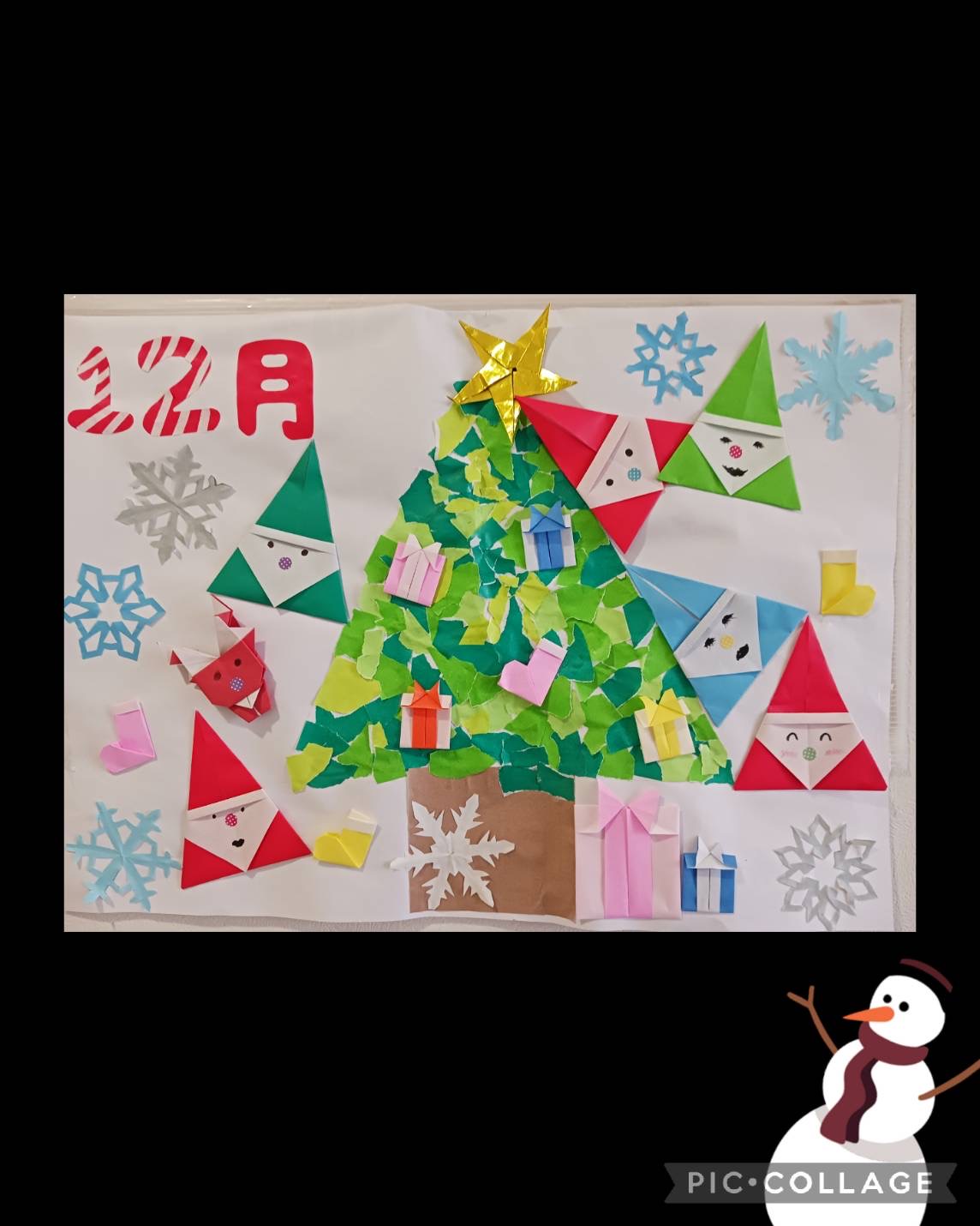 今月の壁飾りはクリスマスツリーのちぎり絵と折り紙で作ったサンタさんです🎅